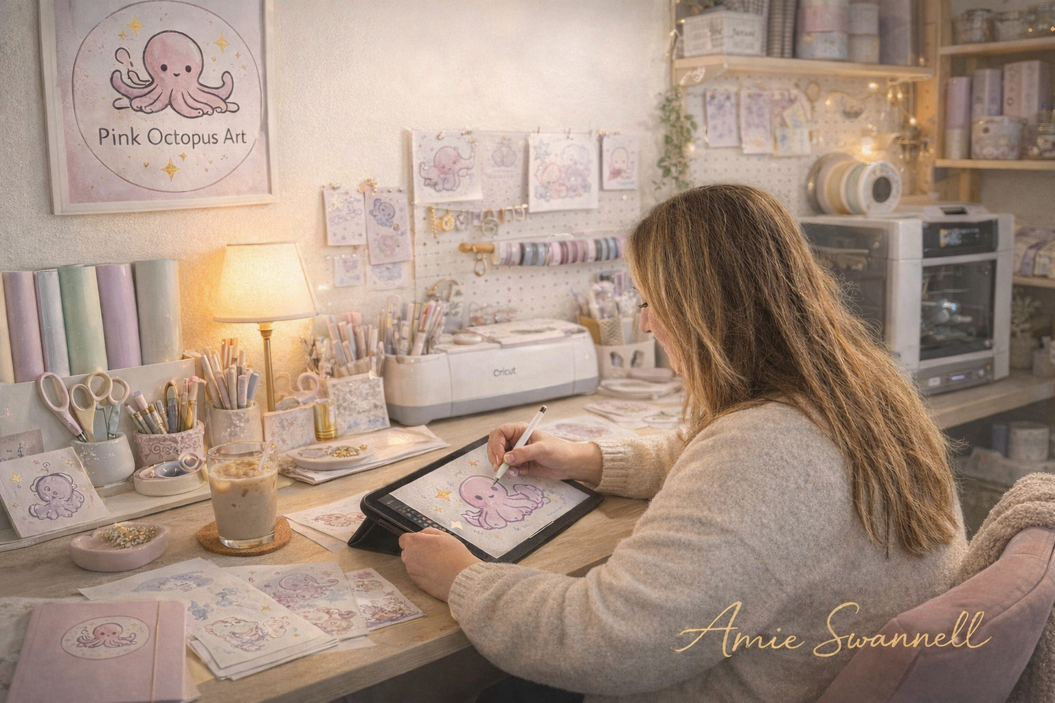 Designed by artist Amie in the UK, Pink Octopus Art brings joyful illustrations, patterns, and gifts to life — from cosy mugs and wall art to fabric designs, digital downloads, and handmade treasures